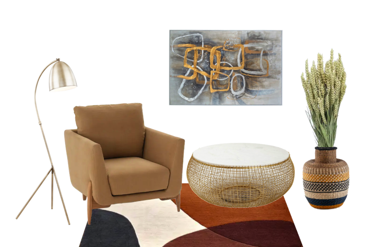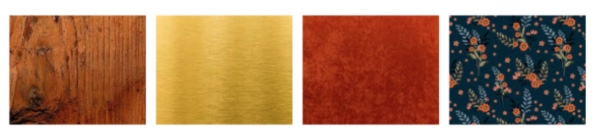 Parmi les matières on retrouve entre autres le bois brut couleur miel ou foncé, laqué ou mat, de l’acier, du velours. Quant aux couleurs elles sont chaudes.