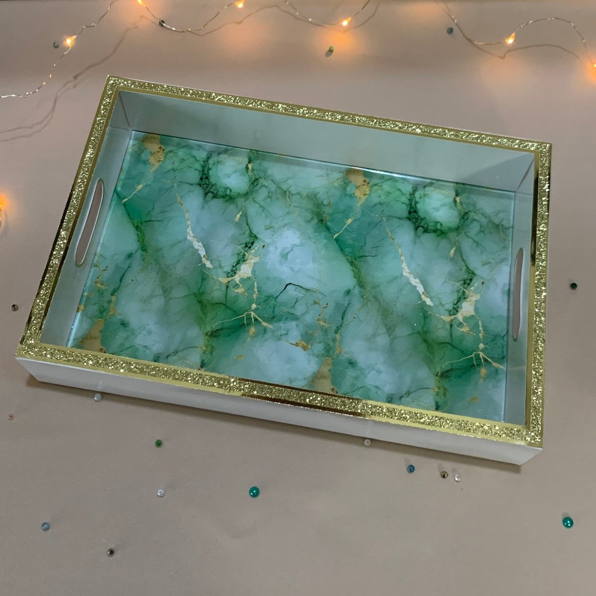 Présentez vos cadeaux sur un joli plateau avec la thématique de votre choix. Vous pouvez y mettre un centre de table, une carte et d’autres surprises.